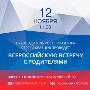 07.10.201912 ноября в 11:00 пройдёт Всероссийская встреча с родителями, в ходе которой Сергей Кравцов и специалисты Рособрнадзора ответят на все вопросы о ЕГЭ, ГИА-9, НИКО и ВПР, а также об исследованиях по стандартам PISA и о других актуальных темах в 2020 году.