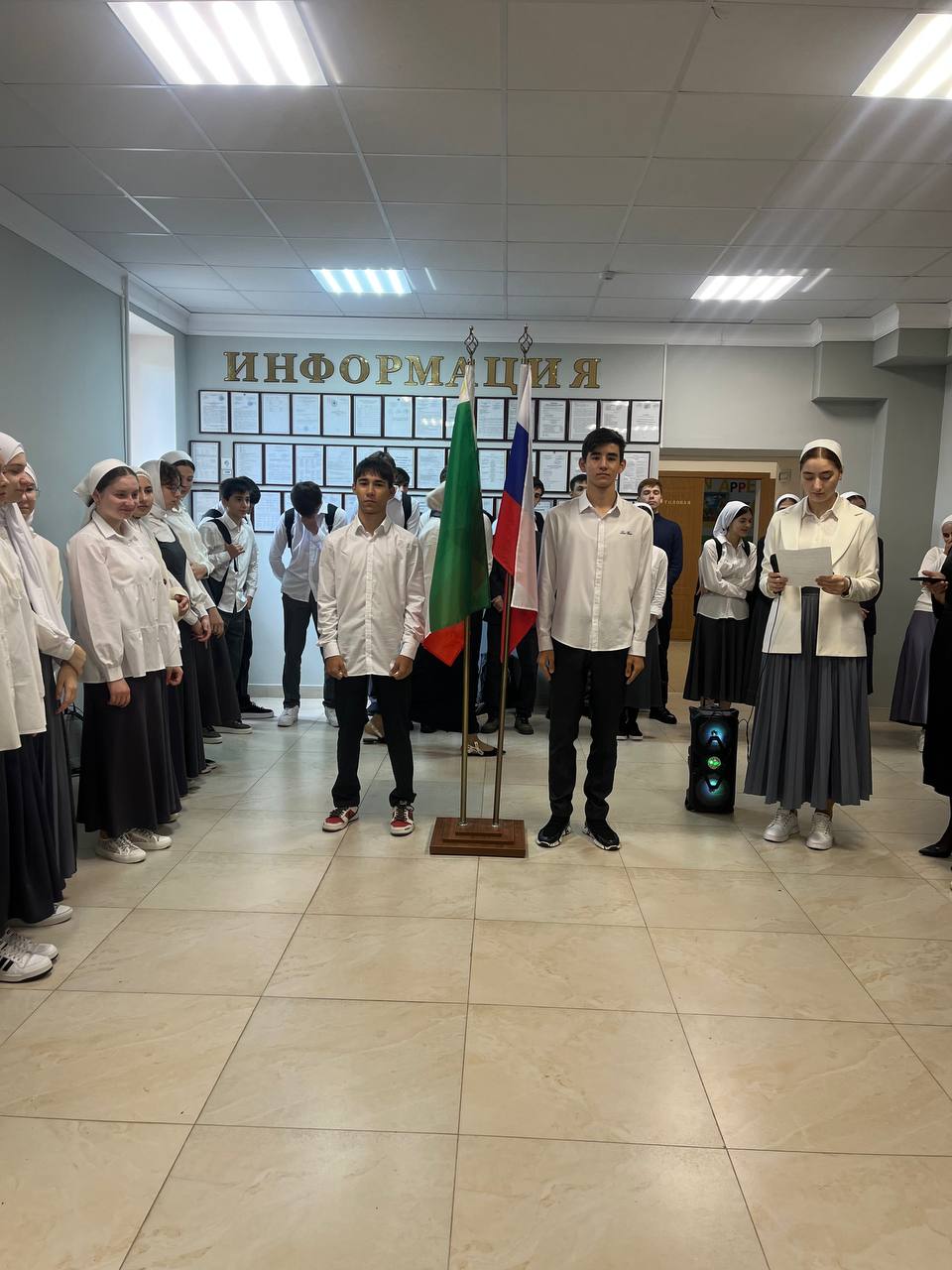 18.09.2023В МБОУ «Гимназия 7» прошла торжественная церемония поднятие государственных флагов Российской Федерации и Чеченской Республики. На линейке был озвучен предстоящий Всероссийский конкурс школьников и условия участия.