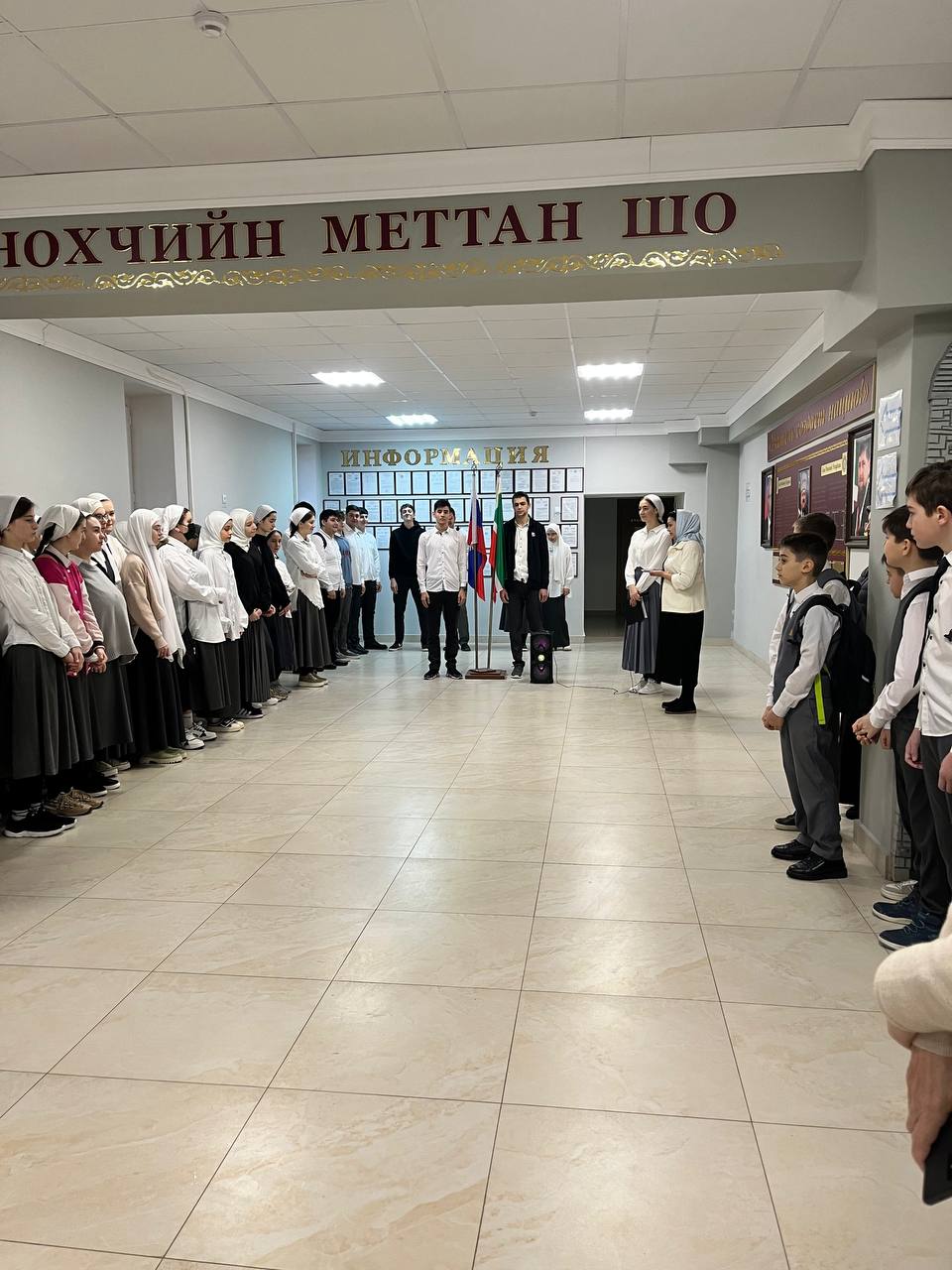 В МБОУ «Гимназия 7» прошла торжественная церемония поднятие государственных флагов Российской Федерации и Чеченской Республики.