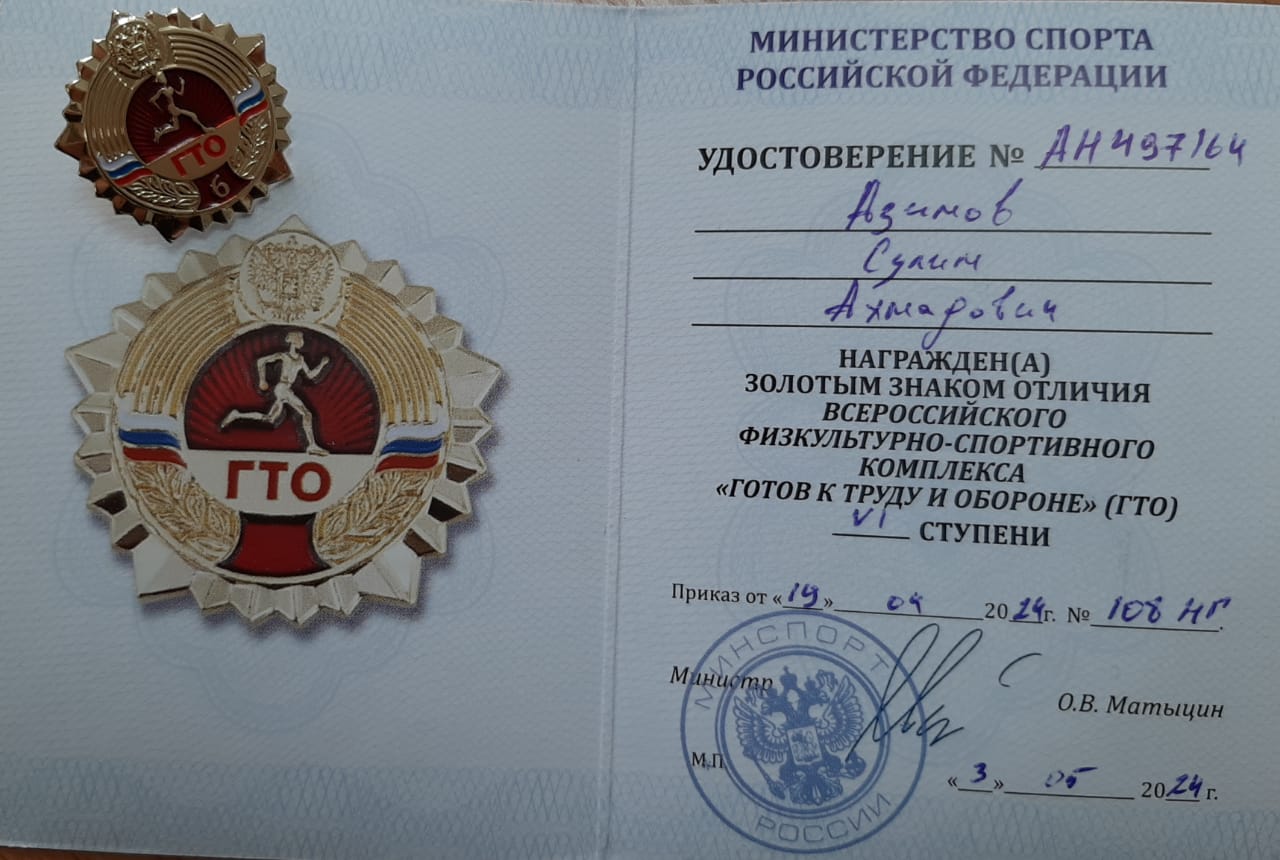 20.05.2024В рамках реализации национального проекта «Образование», созданному по решению Президента России федерального проекта «Патриотическое воспитание», ЗОЛОТЫМ знаком отличия Всероссийского физкультурно спортивного комплекса "ГОТОВ К ТРУДУ И ОБОРОНЕ" (ГТО) VI ступени награжден обучающийся МБОУ «Гимназия№7», г. Грозный, Азимов Сулим Ахмадович.