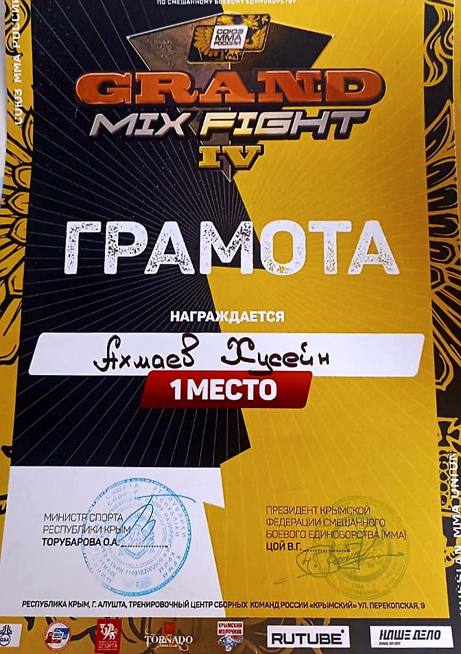 В городе Алушта, республика Крым прошел Всероссийский турнир по смешанным боевым единоборствам (ММА )"Grant Mix Fight-IV" команда юных спортсменов из Чеченской Республики показала отличный результат, подтвердили свое лидерство, первое общекомандное место среди юношей и юниоров, лепту в победу внес и обучающийся нашей гимназии, , Ахмаев Хусейн.