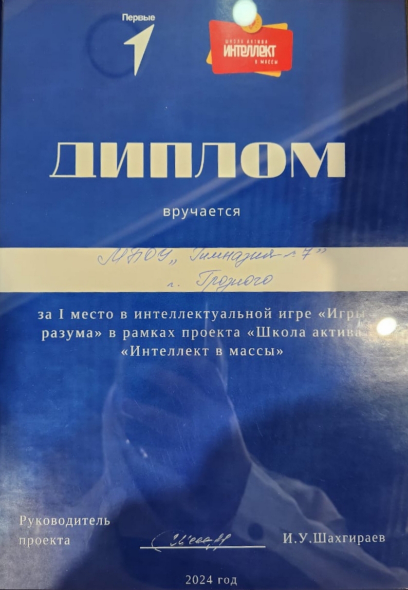 «Первые в Движении первых!» - знатоки МБОУ "Гимназия№7» г. Грозный стали победителями интеллектуального проекта «Школа актива «Интеллект массы»