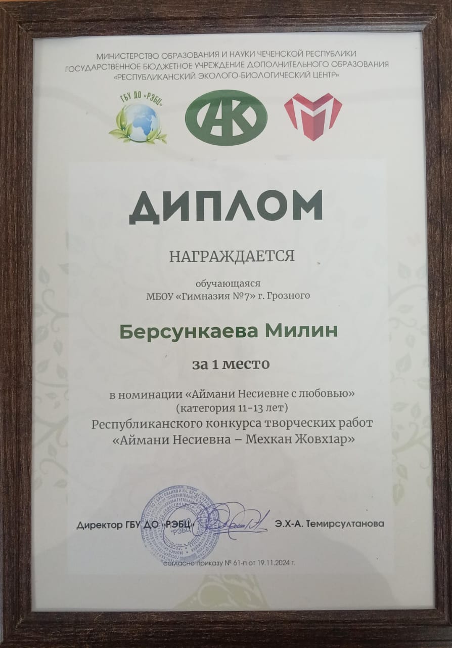25.11.2024В рамках реализации национального проекта «Образование», федерального проекта «Успех каждого ребенка», мастерица кружка «Ловкие ладошки», Берсункаева Милин стала победительницей (1 место) Республиканского конкурса «Аймани Несиевна - Мехкан Жовхар», приуроченного ко Дню Матери в номинации «Аймане Несиевне с любовью!». Работа Милин была высоко оценена жюри за ее оригинальность и мастерство.