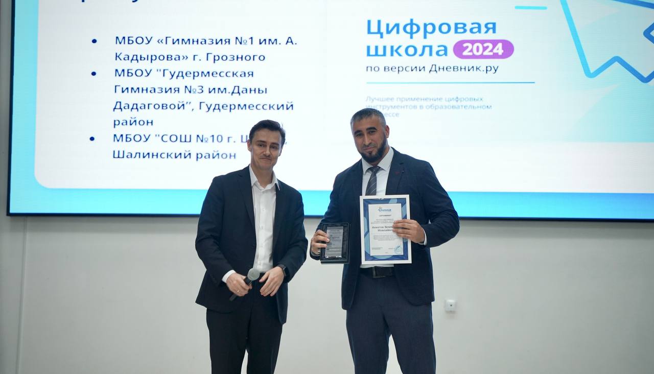 Заместитель директора по развитию ООО «Дневник.ру» Сергей Аркадьевич Издебский вручил награду «Цифровой прорыв года» заместителю Мэра - начальнику столичного Департамента образования Зелимхану Ахматову. Он подчеркнул, что Грозный является лучшим муниципалитетом страны по использованию цифровых инструментов в образовательном процессе.