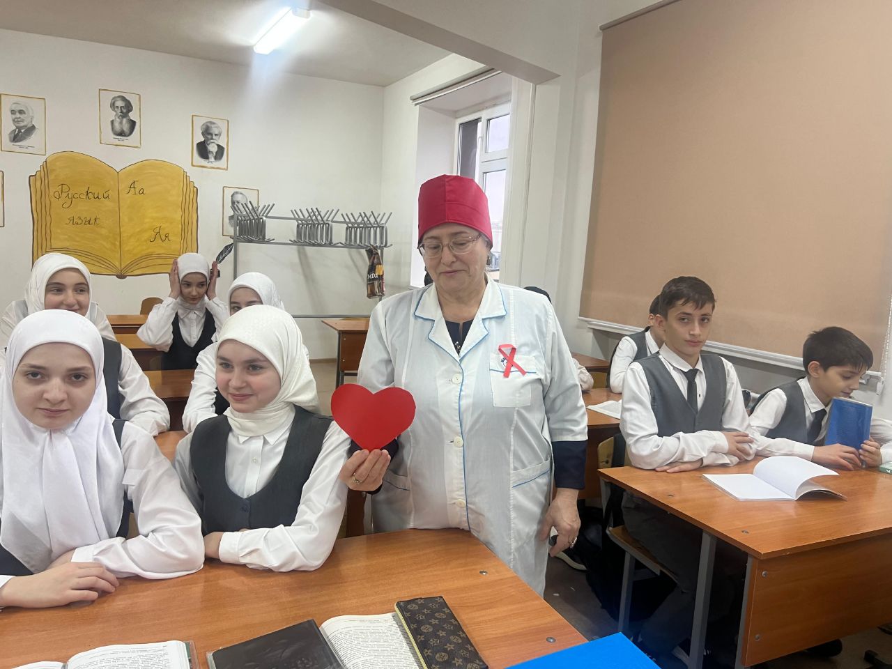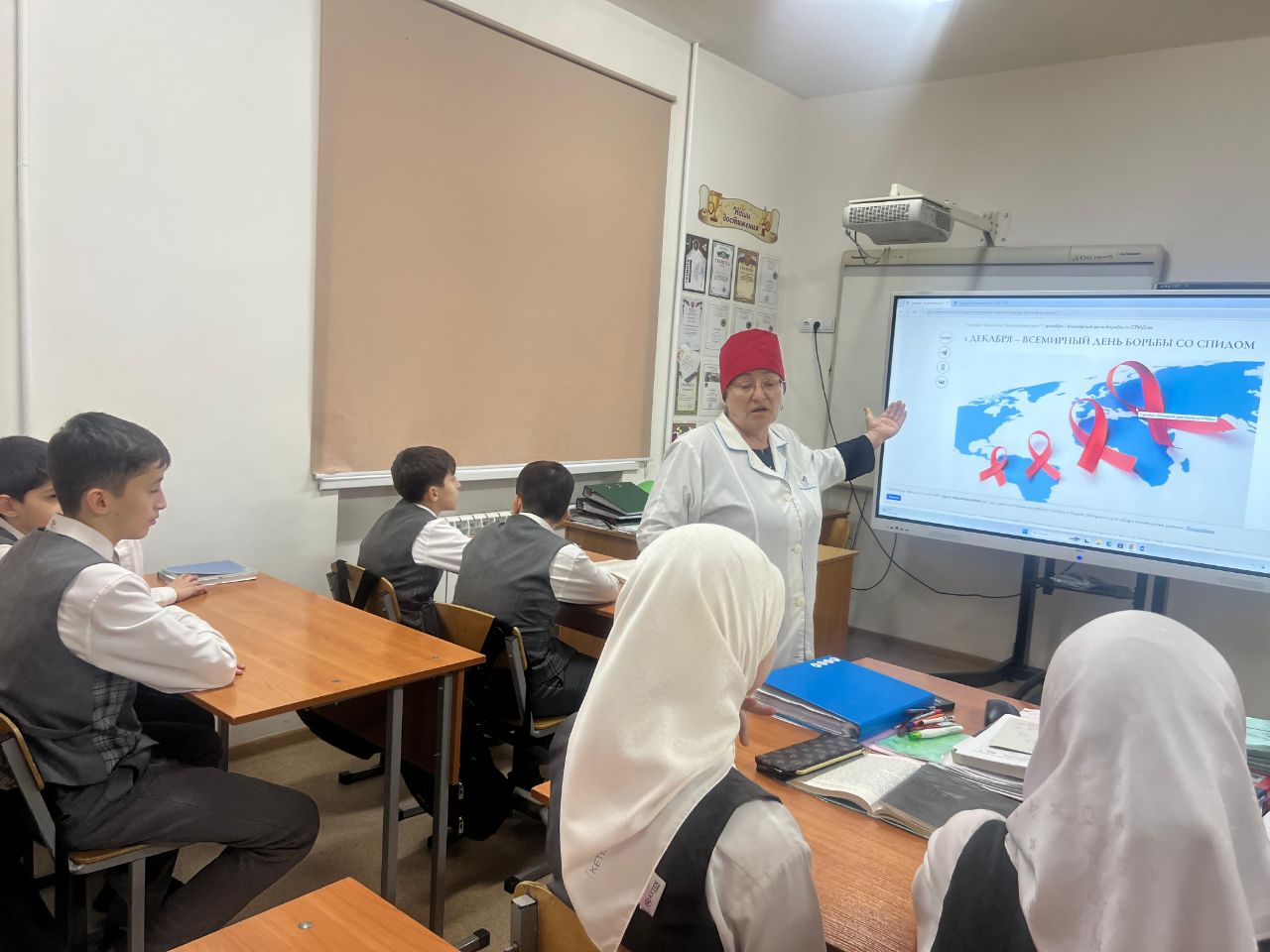 Социальный педагог, Резванова Л.Л., медсестра гимназии Джабраилова Хеда, рассказали ребятам о профилактике и лечении такого серьезного заболевания, как ВИЧ-инфекция. Ребята получили представления о распространенности болезни в мире, способах её передачи, современных методах диагностики и возможностях современной медицины в лечении и профилактике этого заболевания.